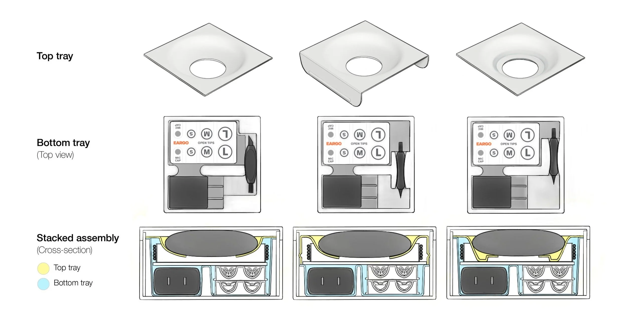 I worked on this project until the second round of prototyping. Afterwards, adjustments were made to the trays as a result of requirement changes to the accessories pack and the switch to polystyrene.