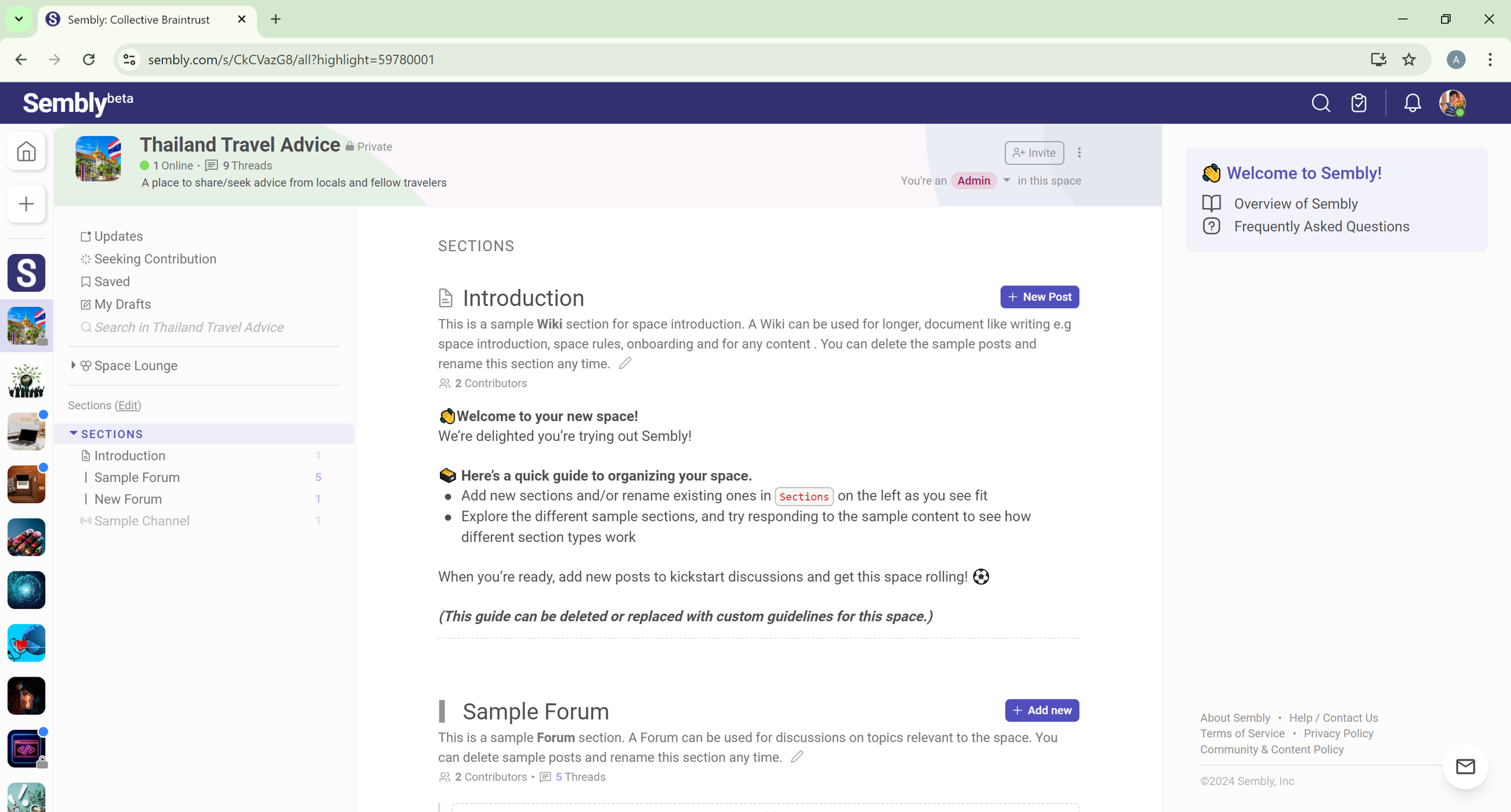 Sembly houses a collection of spaces on a variety of subjects. Each space can be structured to best suit its needs, with templates available for different use cases.